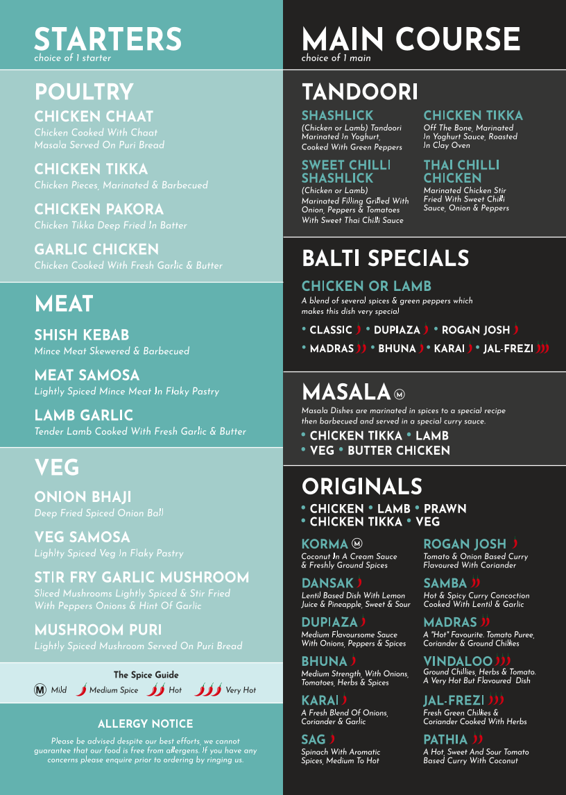 2x poppadums with chutney, choose any 2x starters, choose any 2x main course, choice of bombay aloo or mushroom bhaji side dish, 1x pilau rice, 1x naan bread & 1x portion of chips